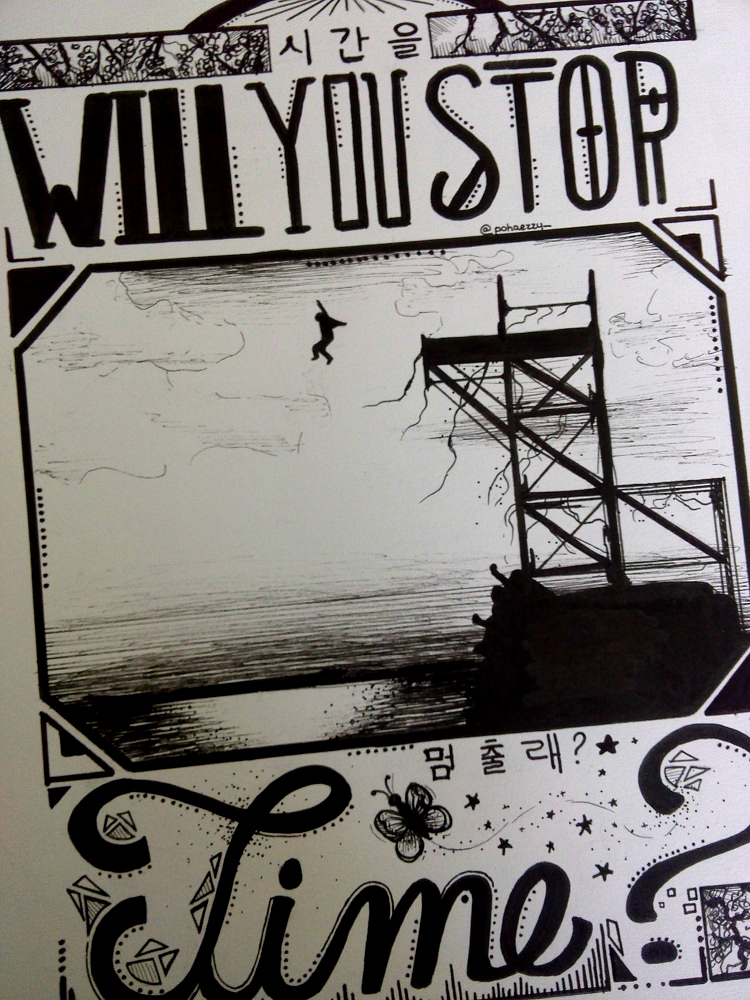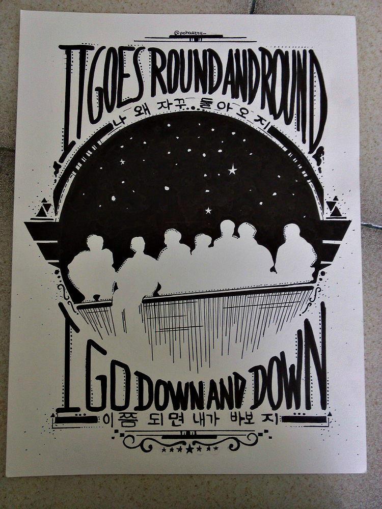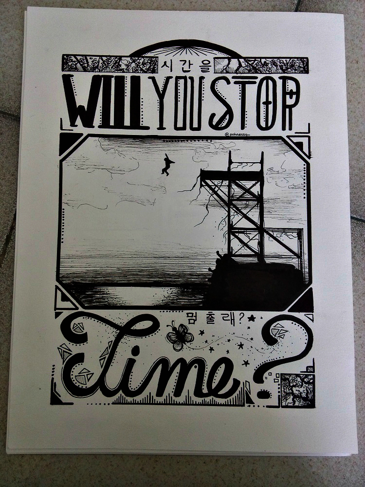 Sinon, pour chaque dessin, j'ai consacré à peu près trois voire quatre heures (je fais d'abord tout au crayon, puis après je fais les lettres au marqueur, puis les dessins au stylo, et je prends pas mal de temps pour rajouter des détails aussi).